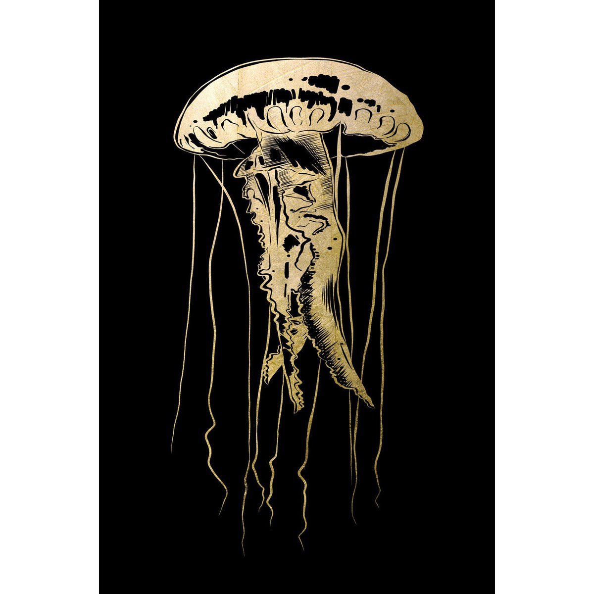 Ein Hauch von Luxus trifft auf die Magie der Tiefsee – unser Kunstwerk auf Blattgold vereint das Schimmern des Ozeans mit der Eleganz der Nacht. Die zarte Qualle auf schwarzem Hintergrund wirkt beinahe wie ein Wesen aus einer anderen Welt, das in ihrem Raum zu schweben scheint.